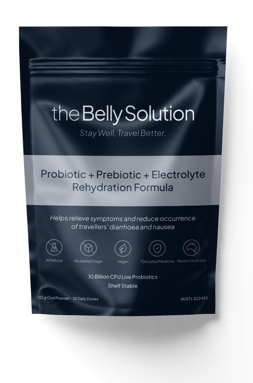 Our Probiotic + Prebiotic + Electrolyte Rehydration Formula is designed to help support and strengthen gut health prior to travel, provide targeted support if illness occurs, and assist in restoring digestive balance afterwards — offering a more comprehensive approach to travel gut health.